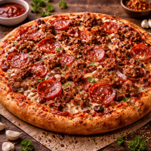 Red sauce, cheese, beef pepperoni, ground beef & beef salami