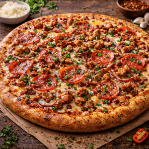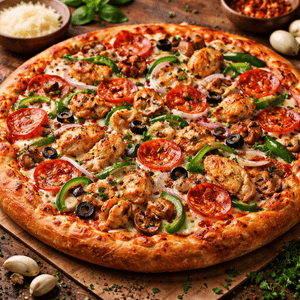 Red sauce, cheese, beef pepperoni, mushrooms, red onions, bell pepper, chicken & ground beef