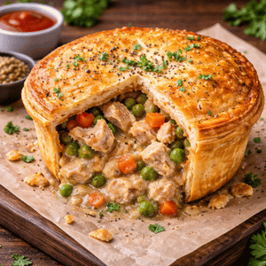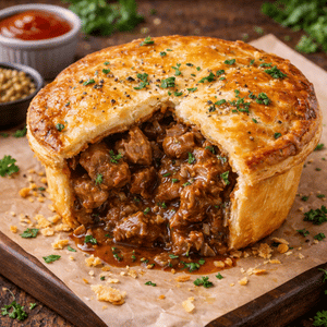 A double crust pie with hot crispy Shell filled with mutton, gravy and spices