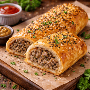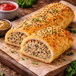 Savory pastry wrap in ground chicken stuffed in a golden flaky crust