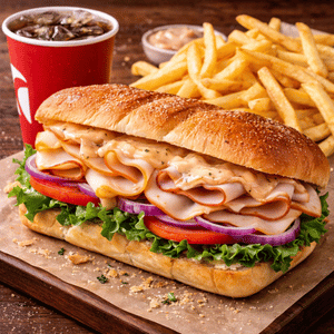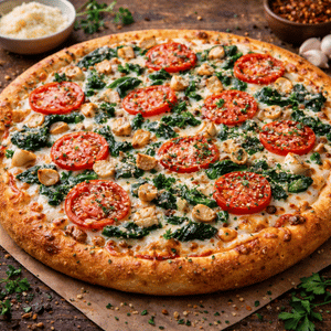 Creamy garlic sauce, cheese, mushrooms, red onions, tomato & chicken