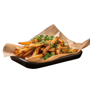 2 pcs 100% lamb sausages topped on a mountain of seasoned fries