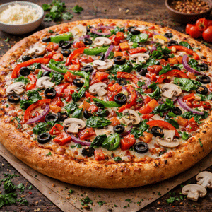 Red sauce, cheese, mushroom, red onions, bell pepper, olives & tomatoes