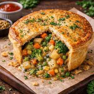 A double crust pie with hot crispy shell filled with vegetable gravy and spices